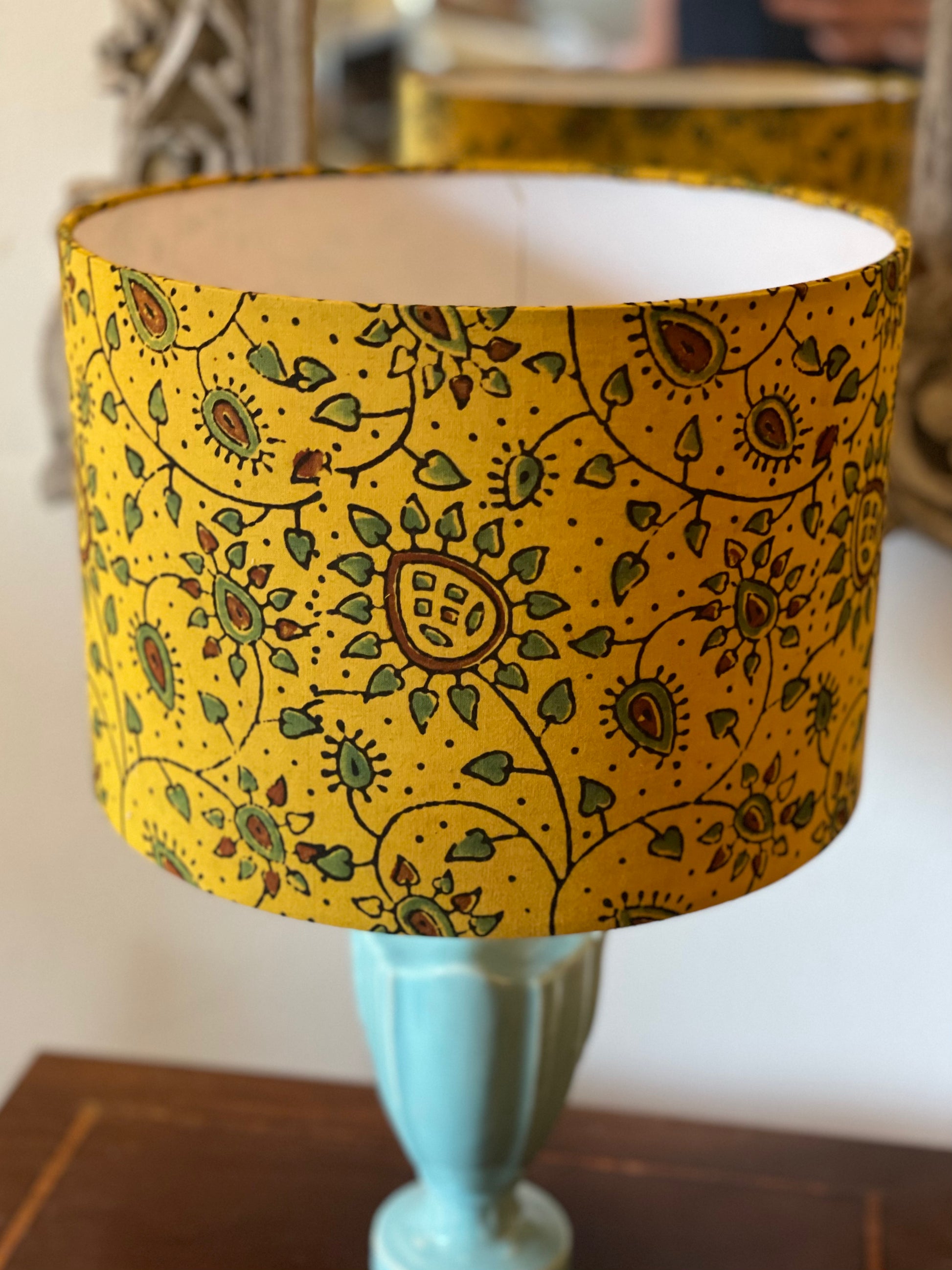 10 inch Drum Lampshade. Ajrakh Hand Block Print from India. Saffron, Olive, and Russet.