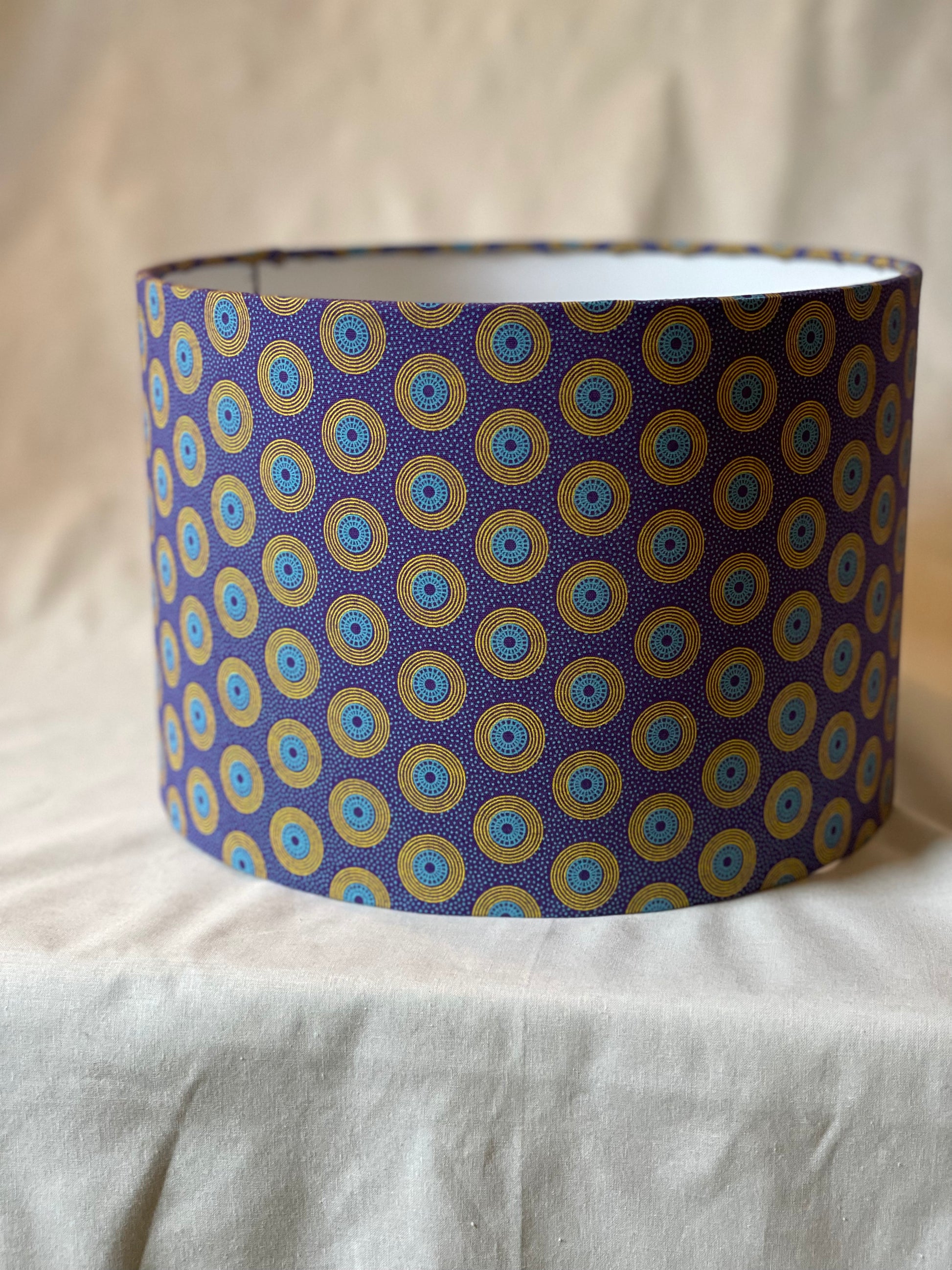 10 inch Drum Lampshade. Dynamic South African Shwe Shwe Print- Purple with Teal and Yellow "LP" Motif