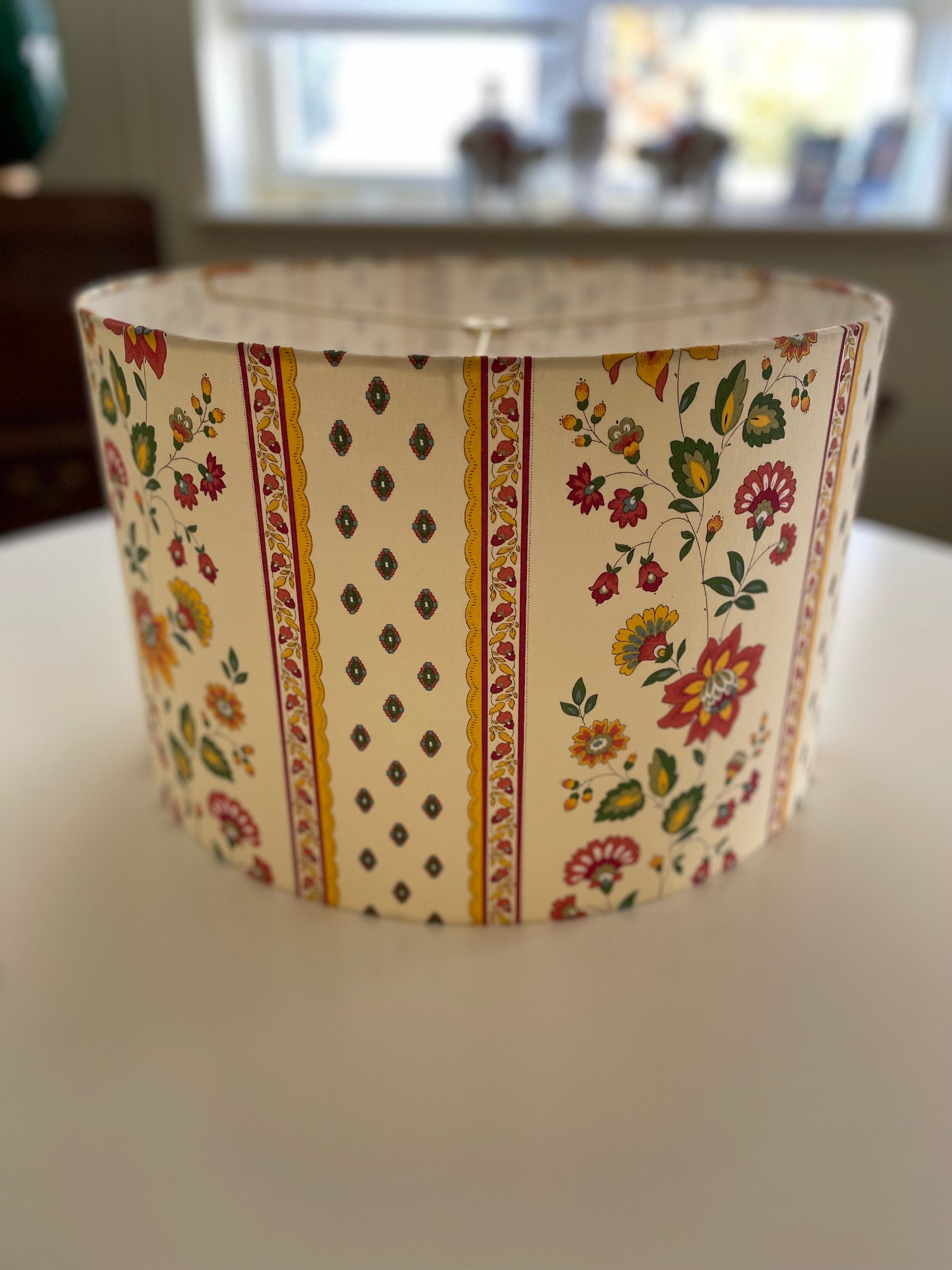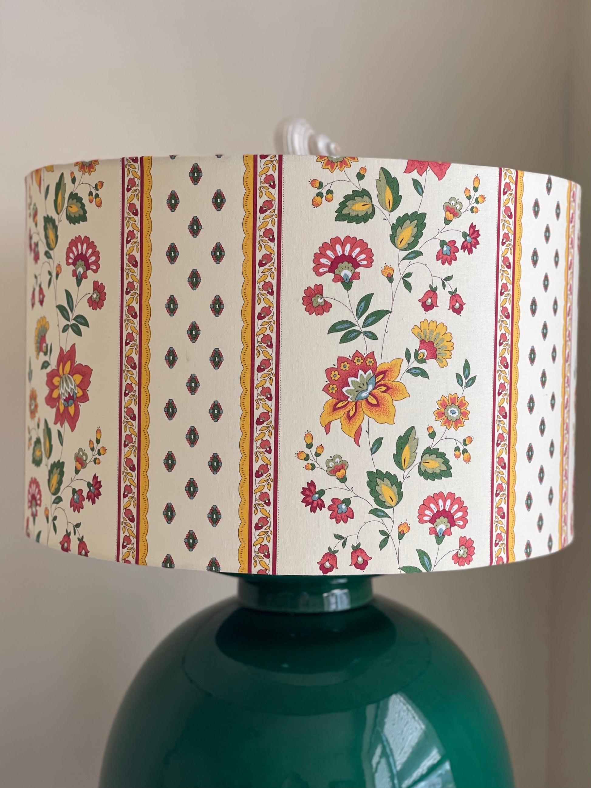 16 Inch Drum Lampshade. French Cotton Fabric. Orange and Red Faience Floral Border.