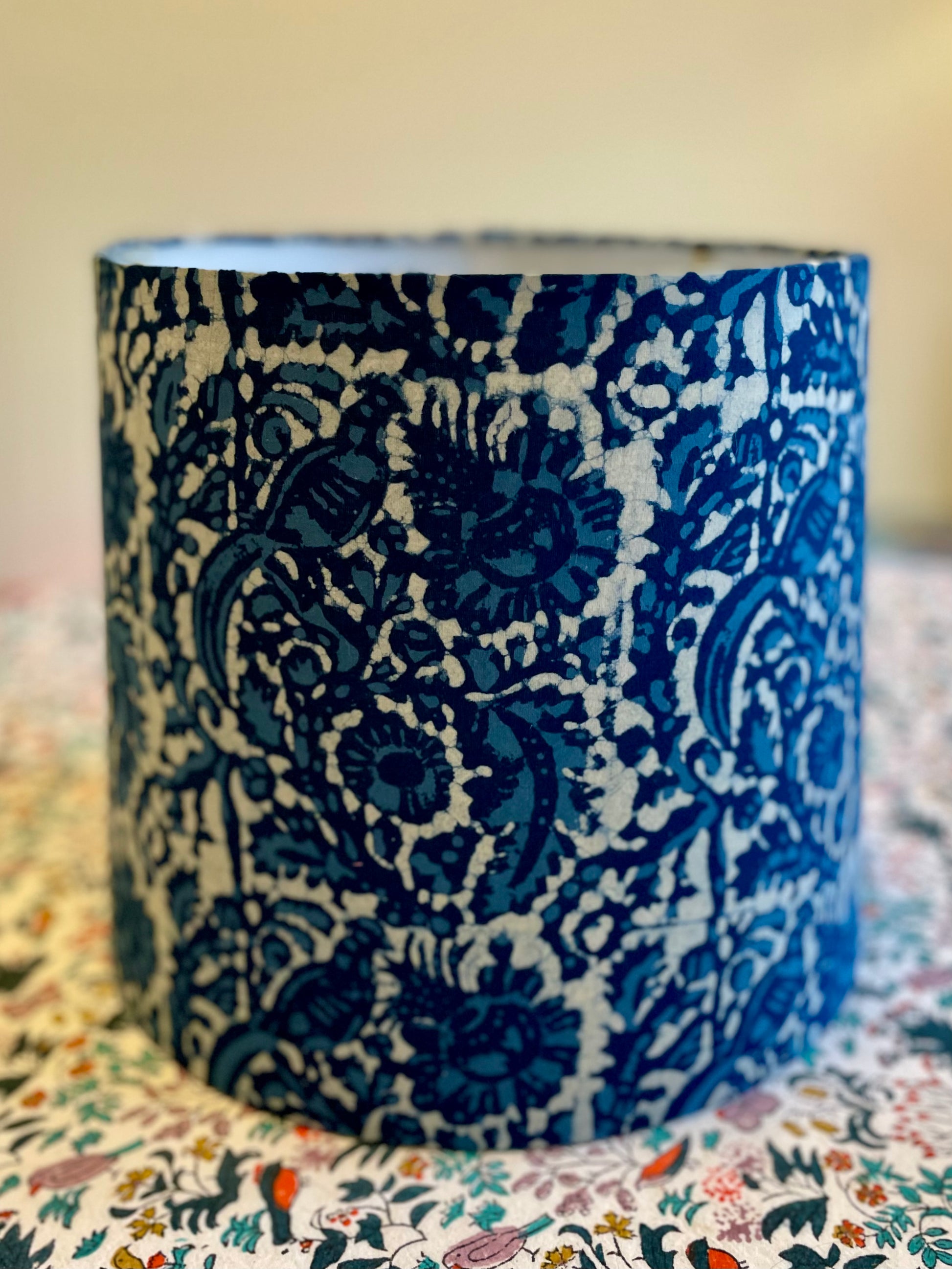 Medium Empire Shade. Indigo Bagru Dabu Indian Hand Block Print. Peacock Motif.
