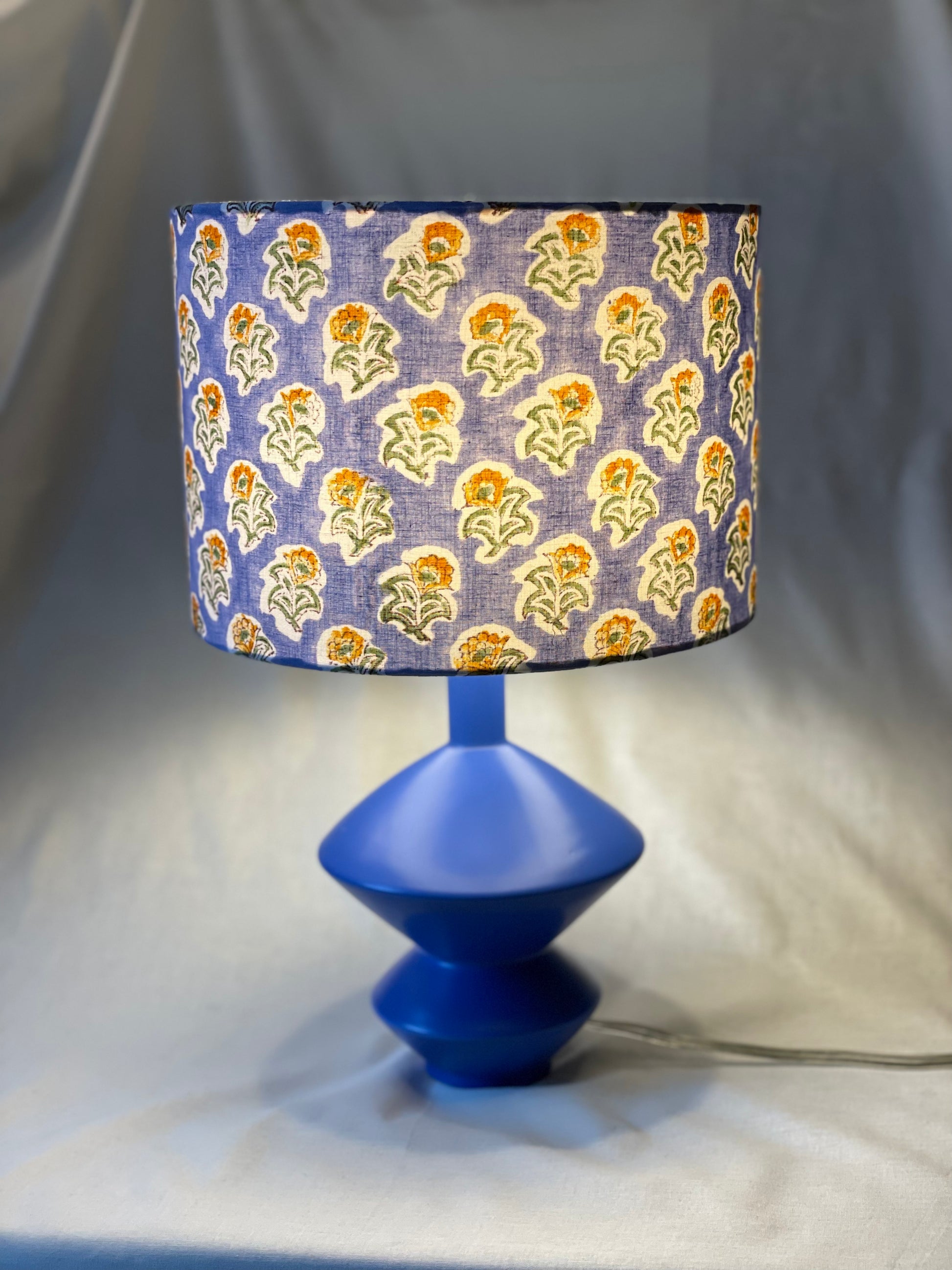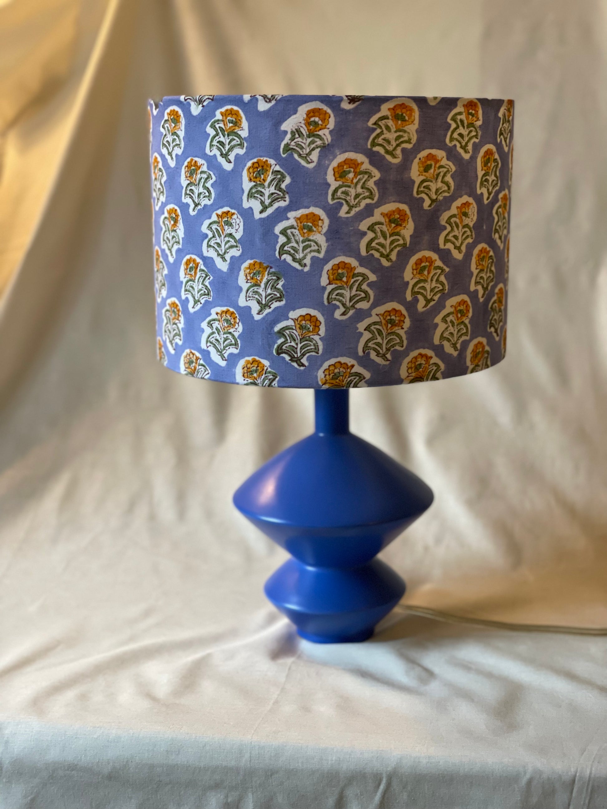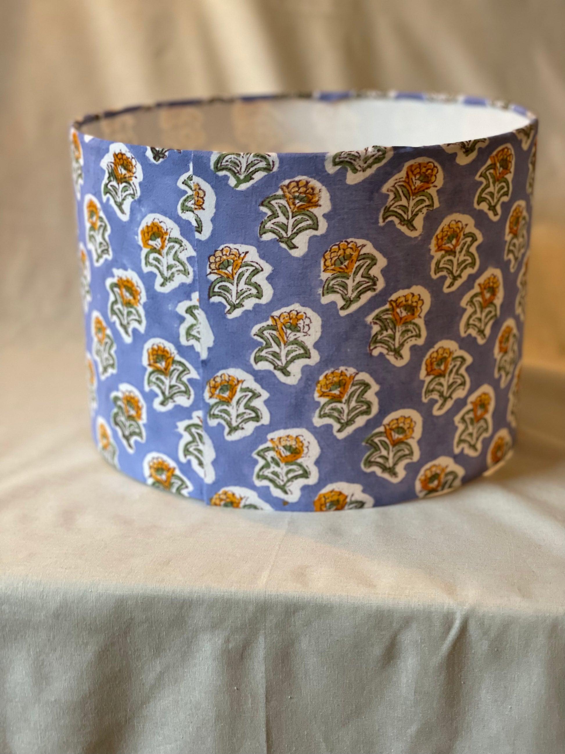 10 inch Drum Lampshade. Indian Block Print- Blue with Yellow Floral Motif.