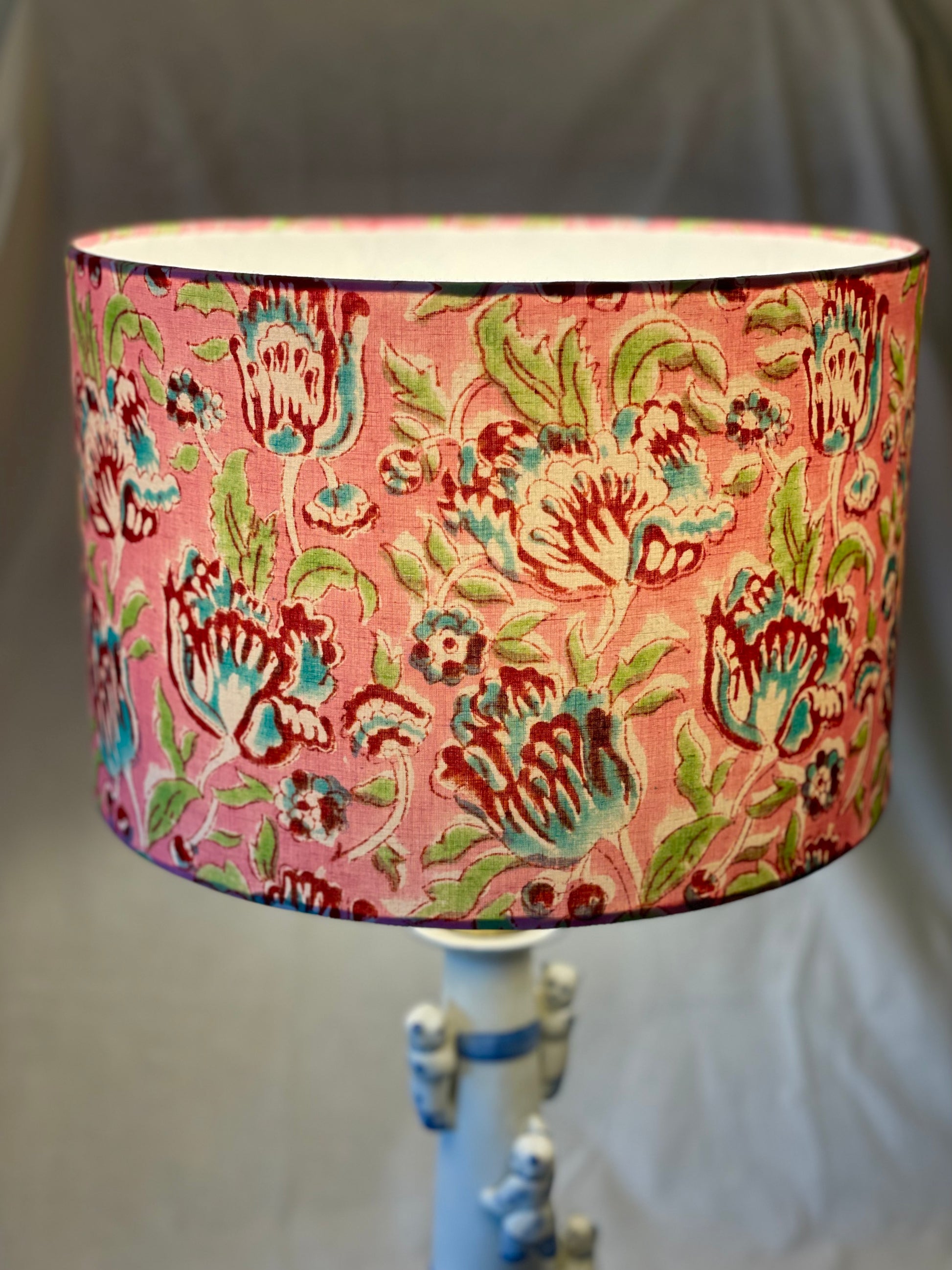 12 Inch Drum Lampshade. Sanganeri Indian Block Print. Light Coral, Deep Rose, Turquoise, and Sea Green.