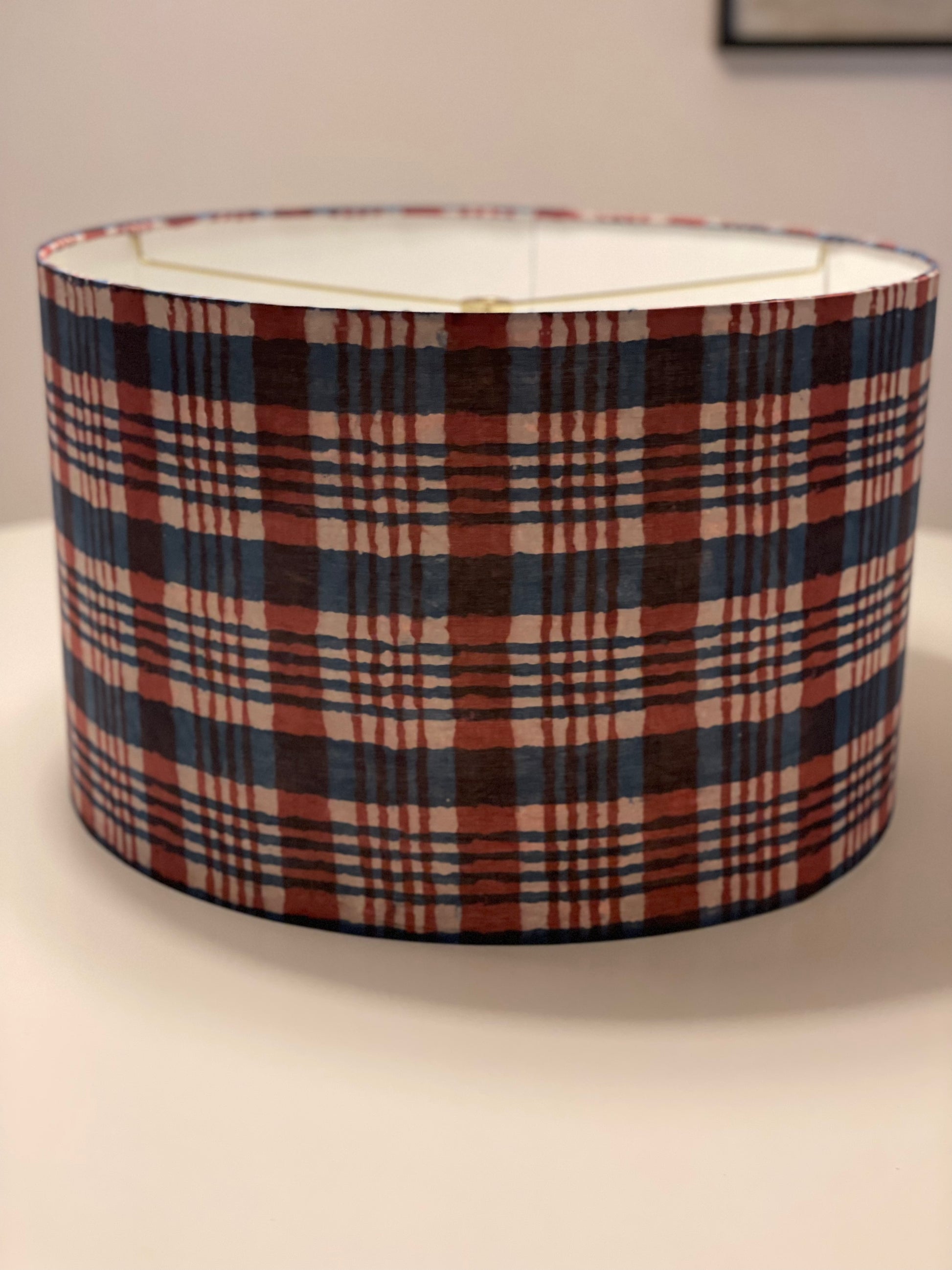 16 Inch Drum Lampshade. Indigo Hand Batik from India. Indigo, Faded Red, and Pale Taupe Plaid.