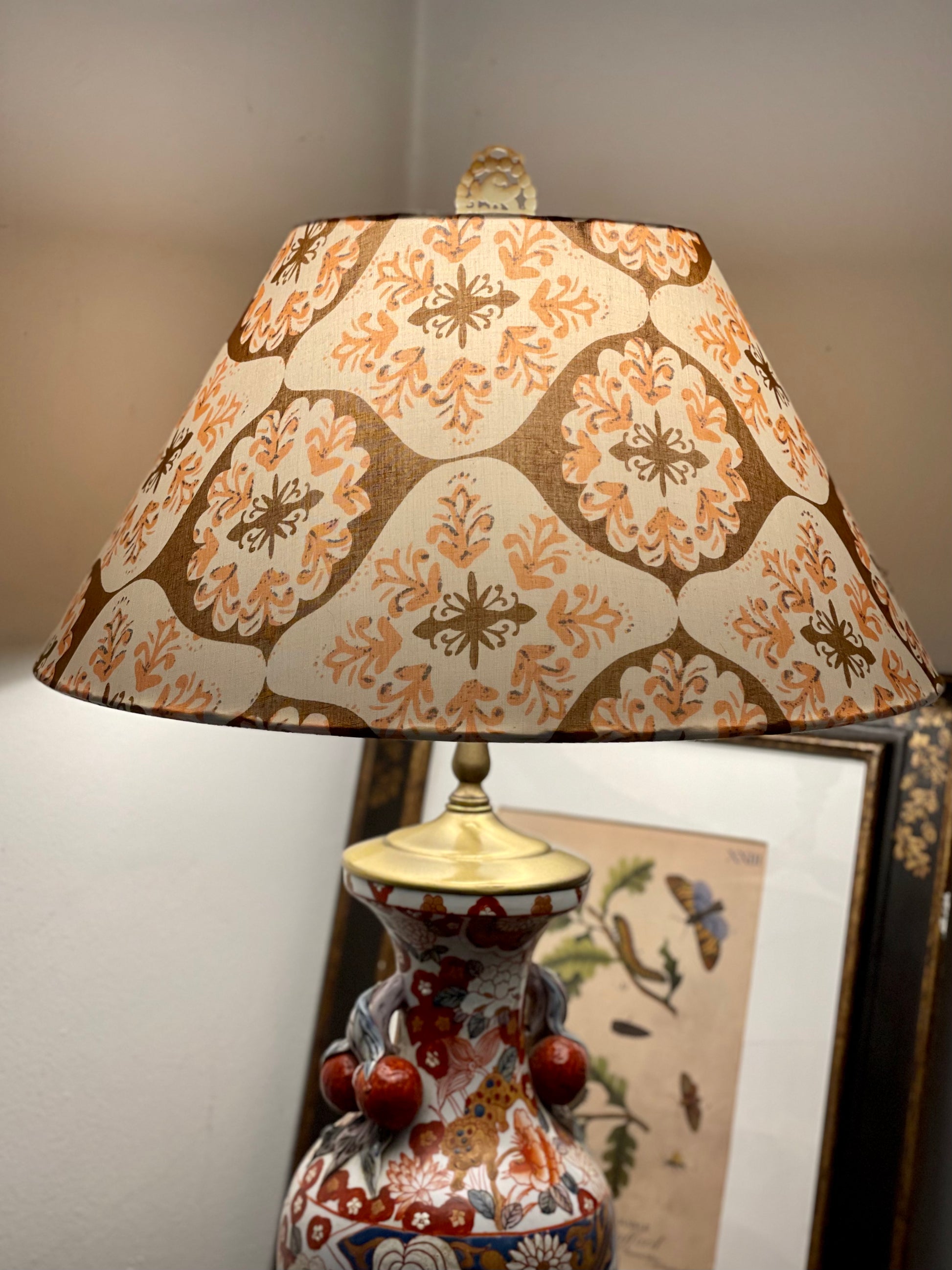 Large Conical Lampshade. Japanese Fabric. Coffee, Pale Salmon, and Bone Mod-Retro Pattern.
