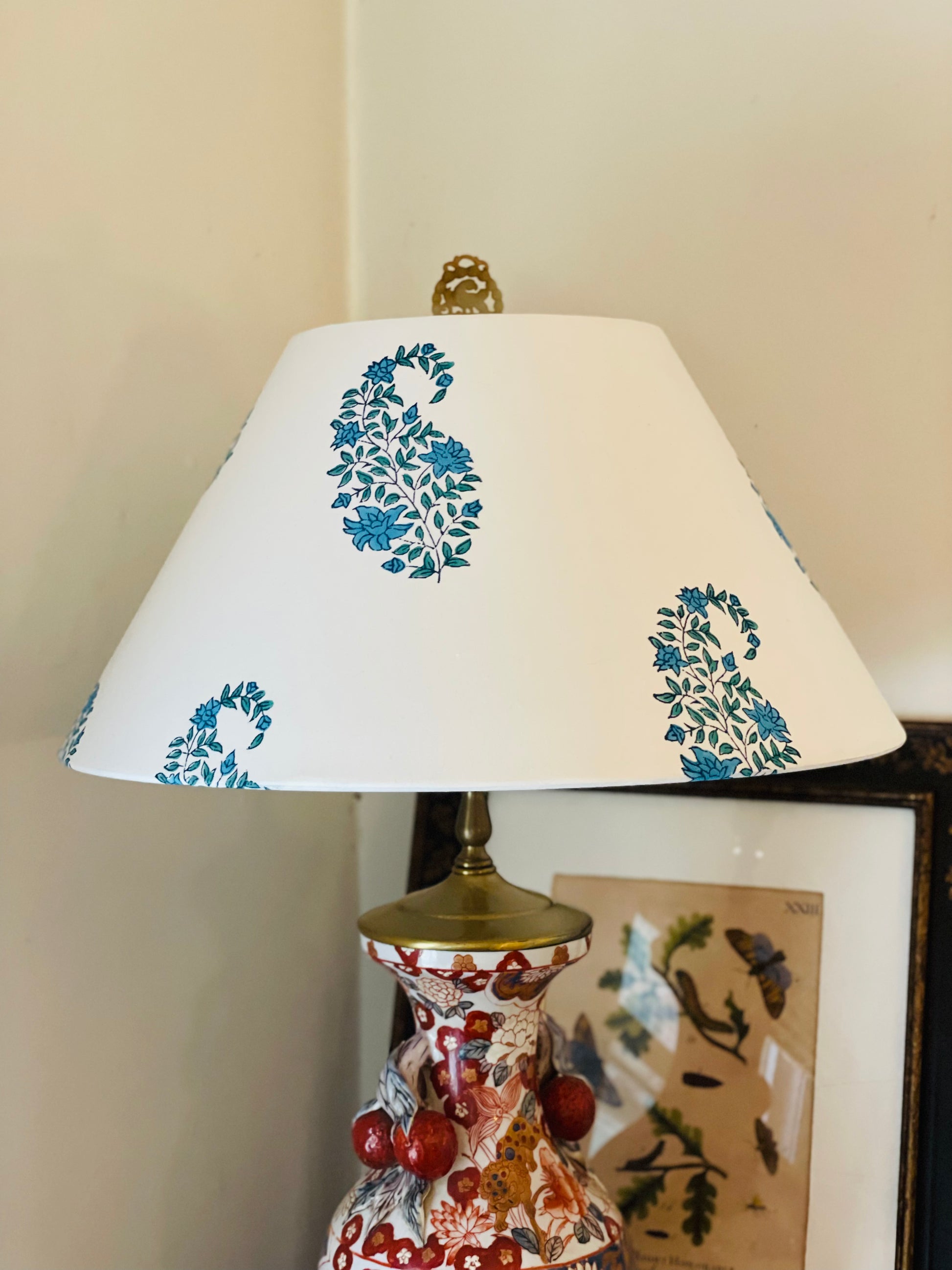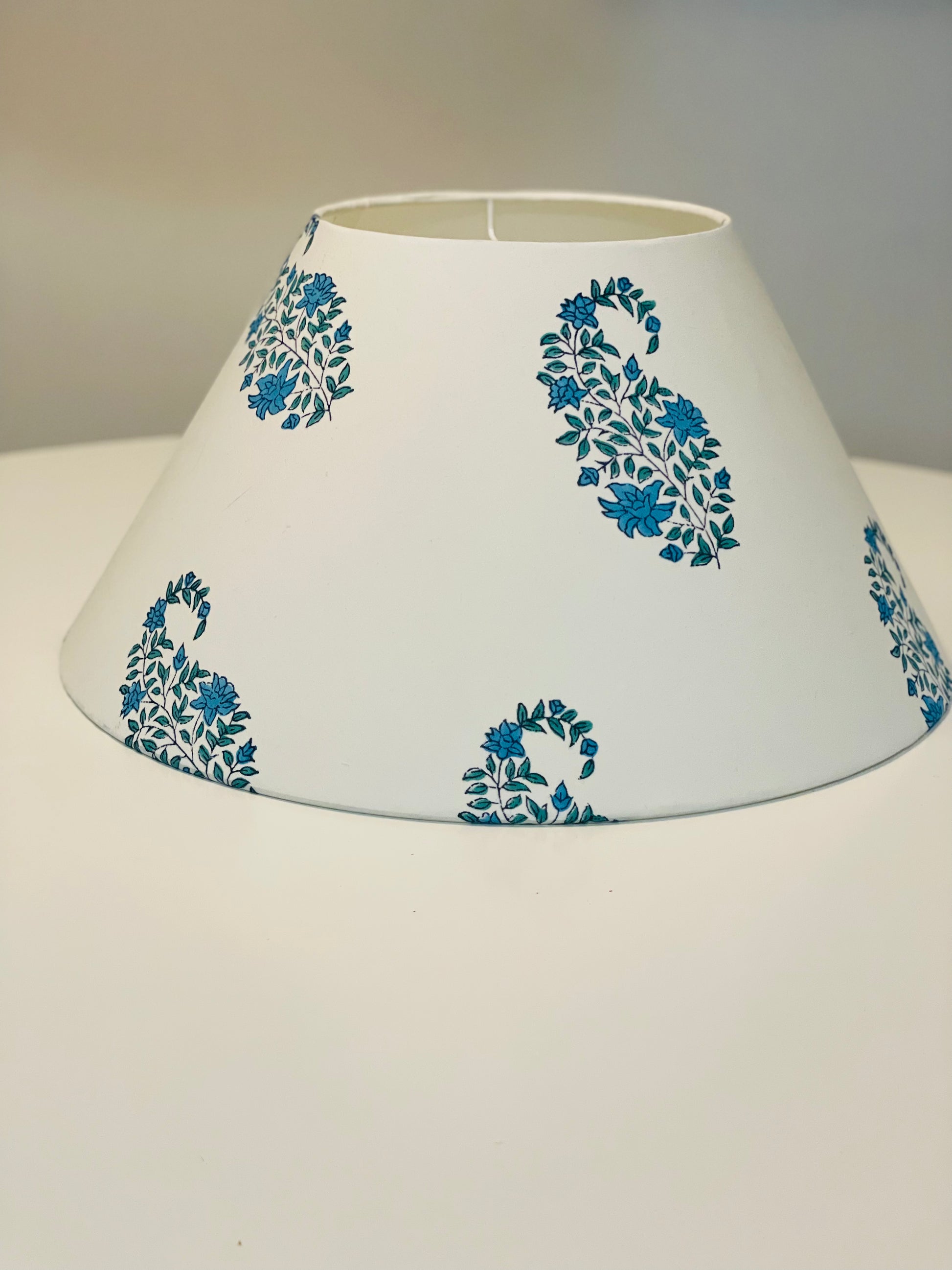 Large Conical Lampshade. Indian Hand Block Print. Teal Blue and Green Buti on Crisp White.