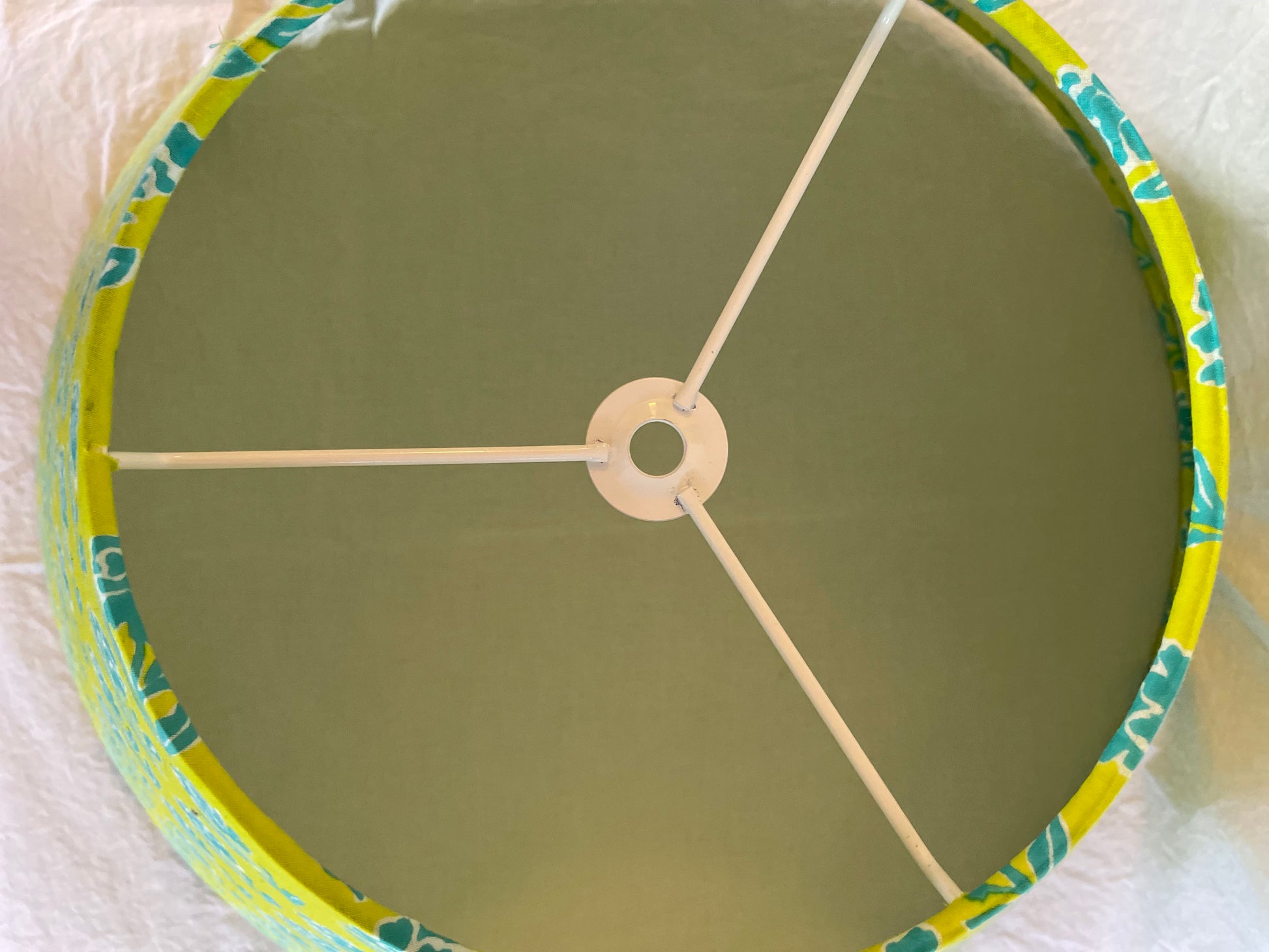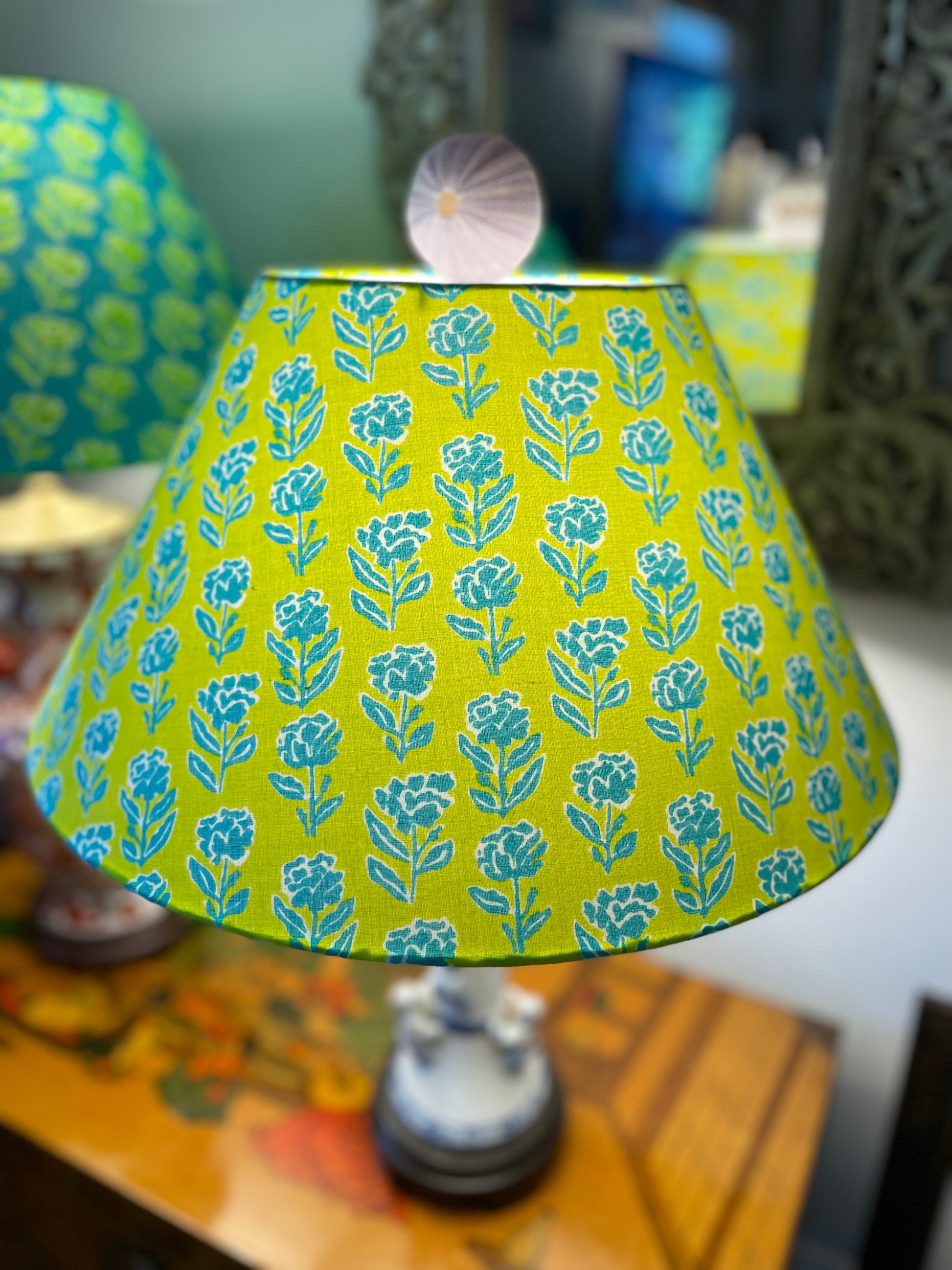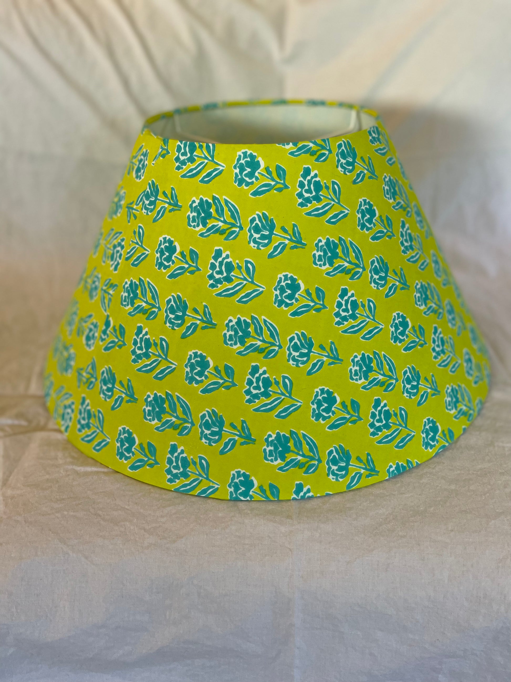 Large Conical Lampshade. Indian Block Print from Jaipur. Lime Green with Teal Floral.
