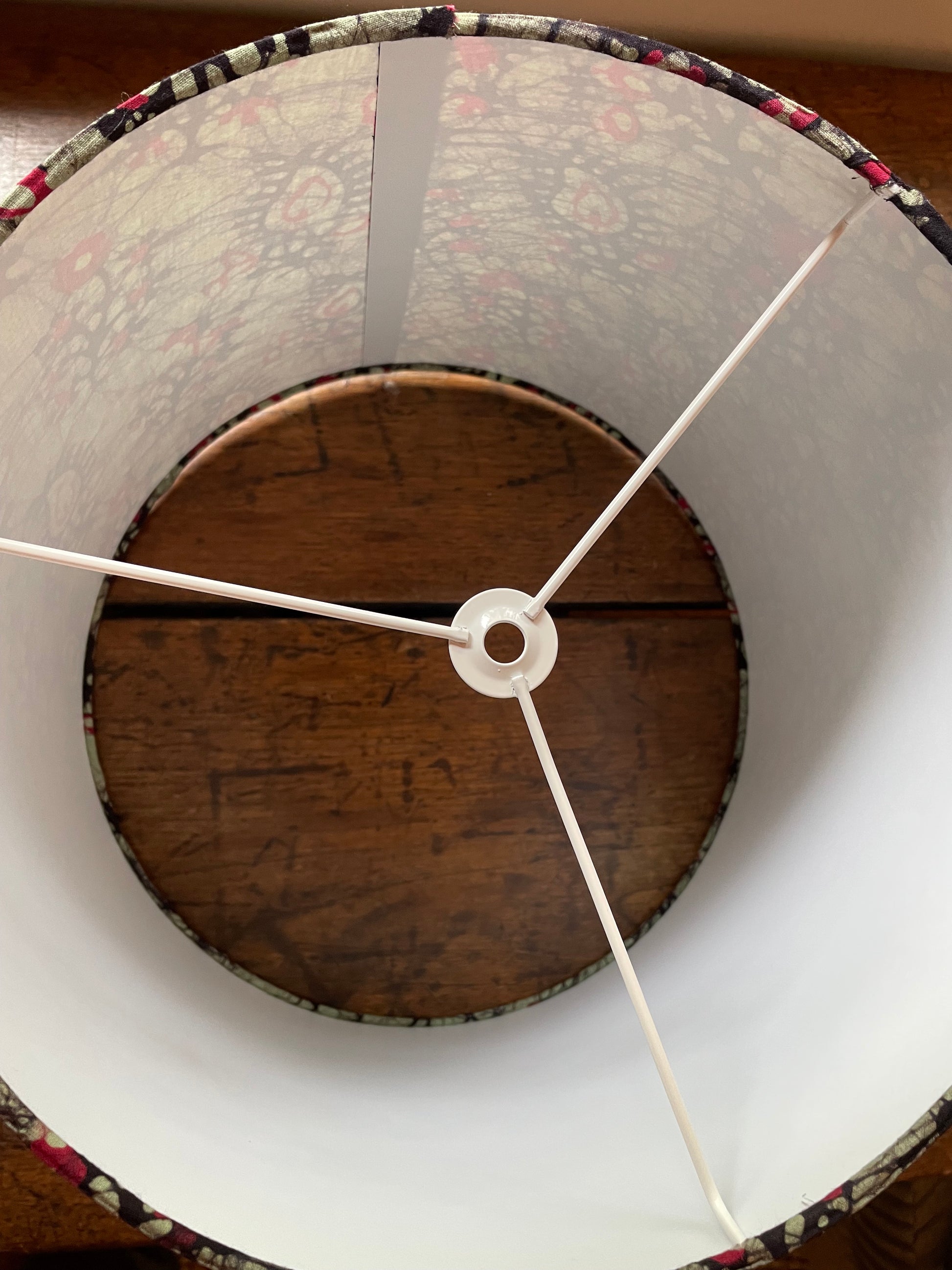 This lampshade is handmade, with vintage, hand printed, hand woven, and/or hand dyed fabric. There will be slight differences, and tiny flaws that would not appear on a mass produced item. I make the shades as carefully as possible, so if there’s ever a problem, please contact me. I’m always happy to work out an exchange or return if you are unsatisfied.