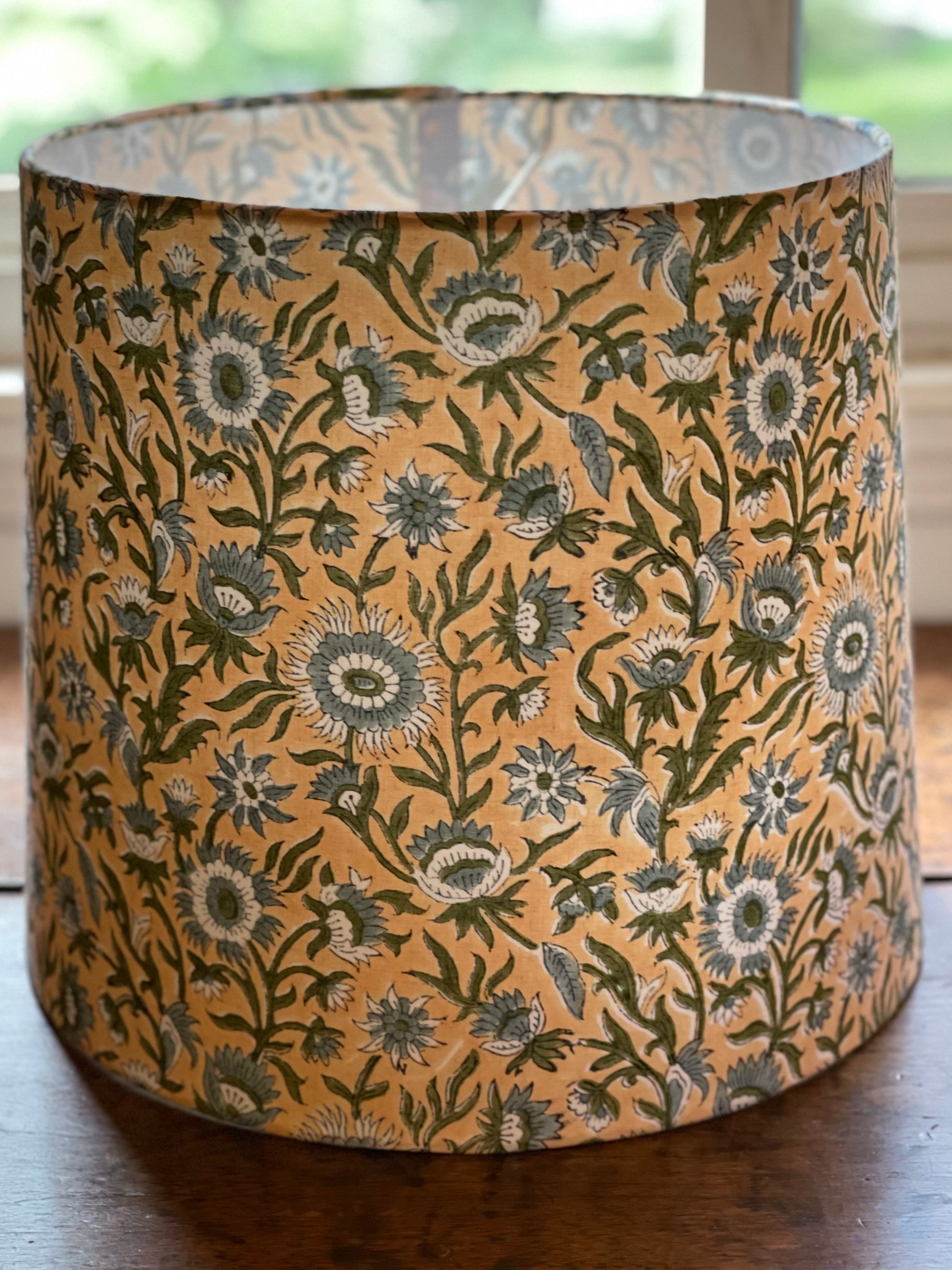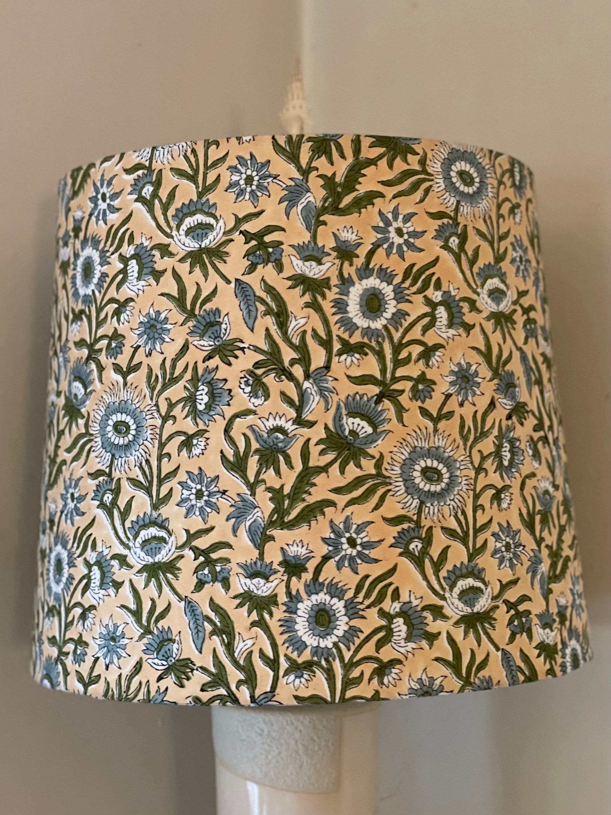 Large Empire Lampshade. 11.75 x 13.75 x 11.75. Indian Hand Block Print. Fawn with Blue-Gray and Dark Green Floral Motif.