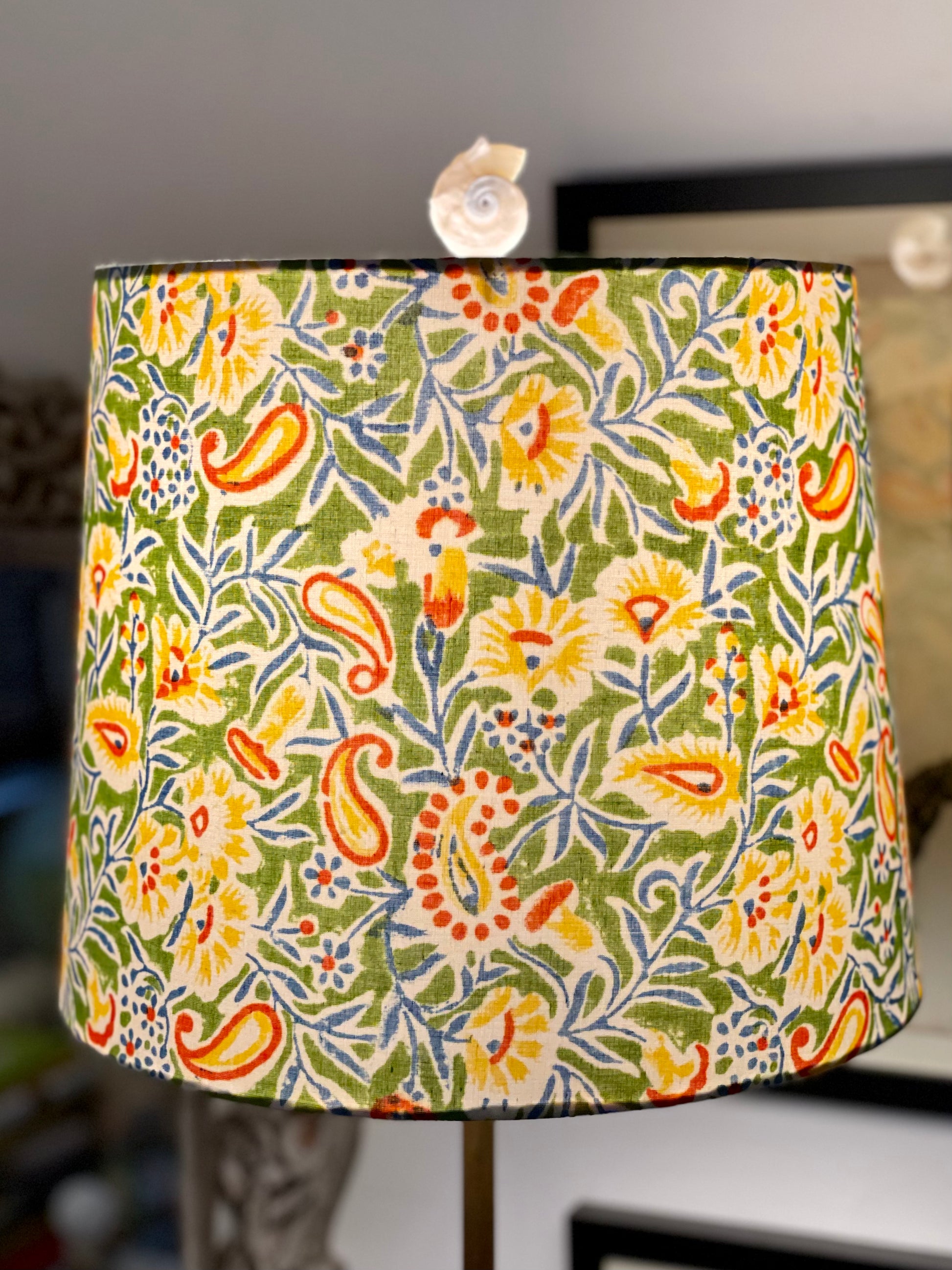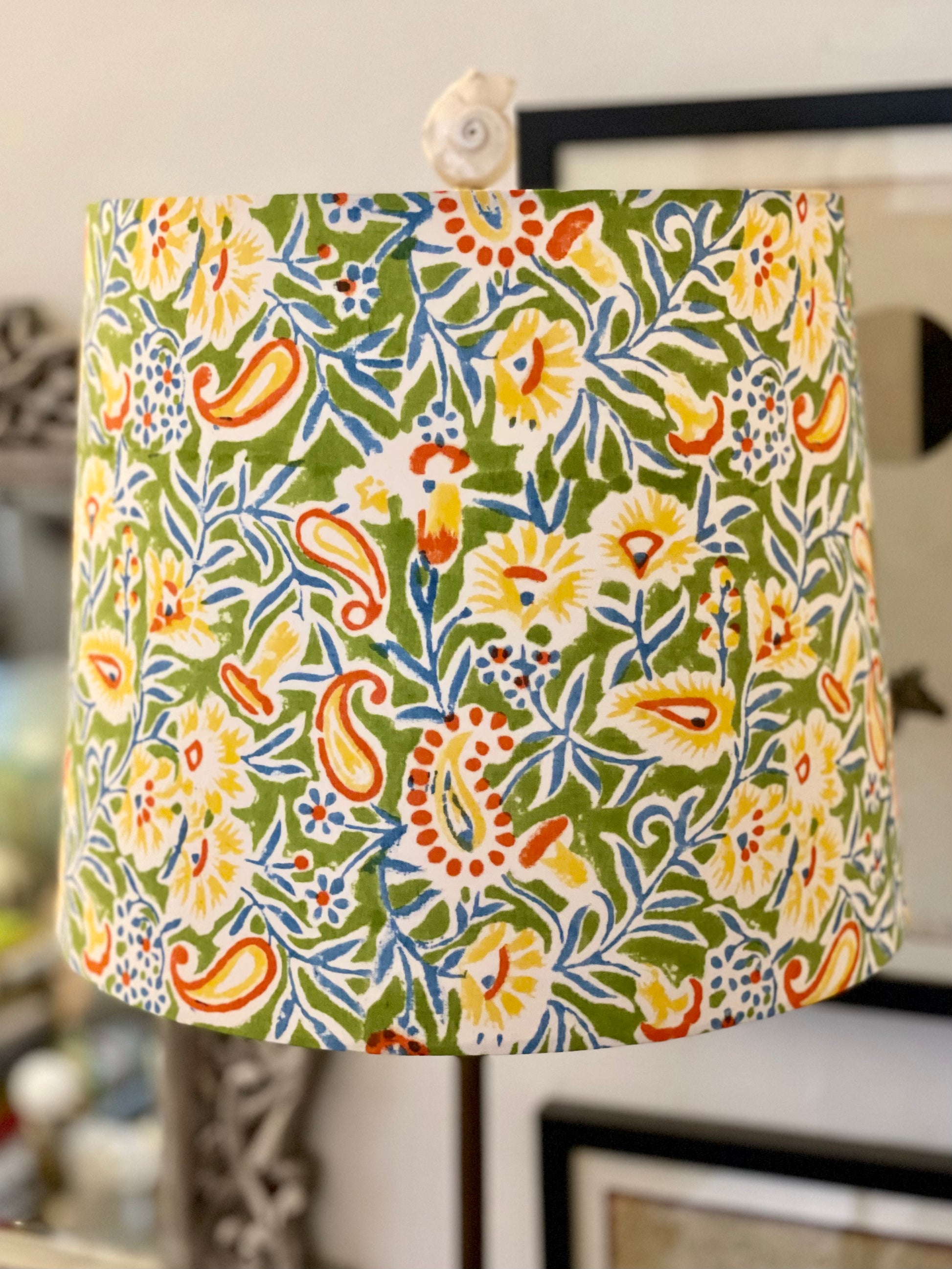 Medium Empire Lampshade. Indian Hand Block Print. Apple Green, Bright Yellow, Red and Steely Blue Floral.