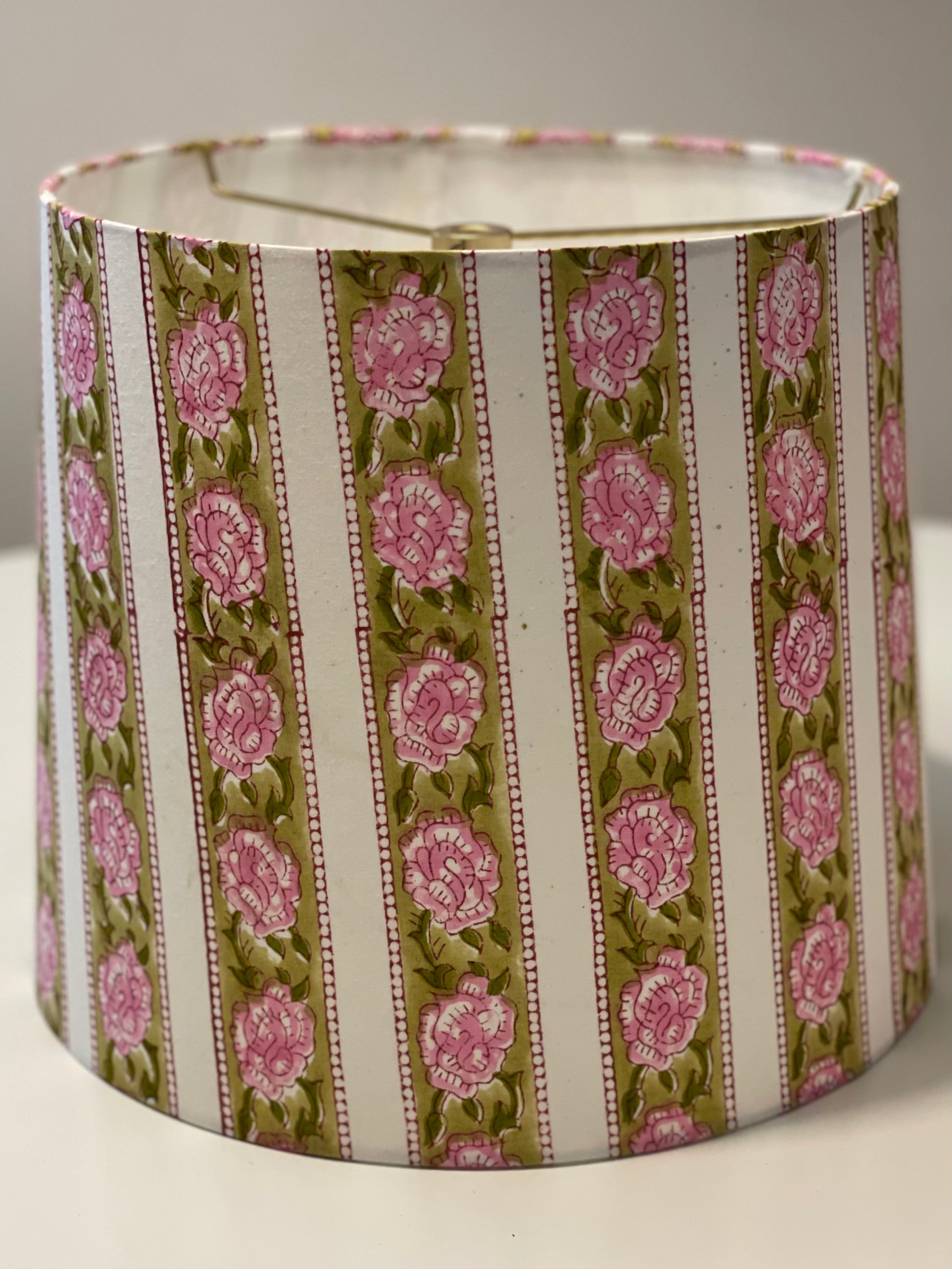 Medium Empire Lampshade. Sanganeri Block Print from India. Ivory and Rose Floral Stripe.