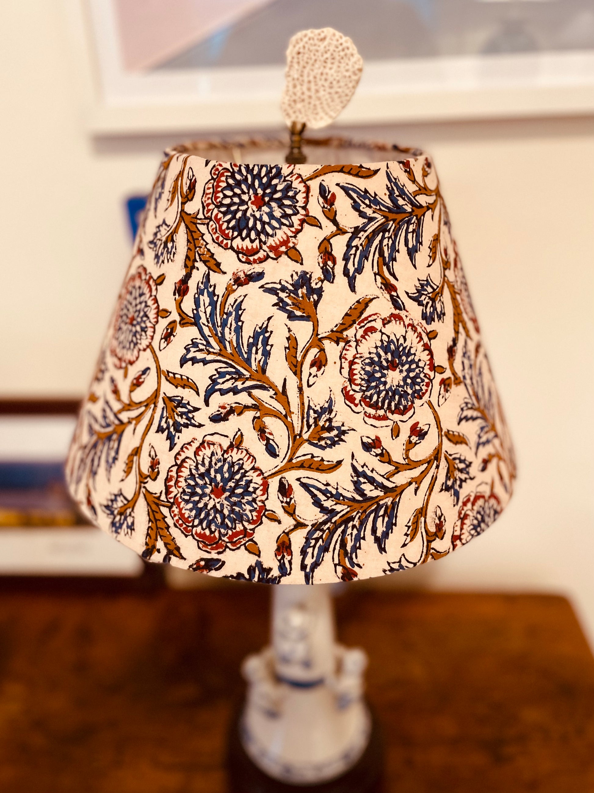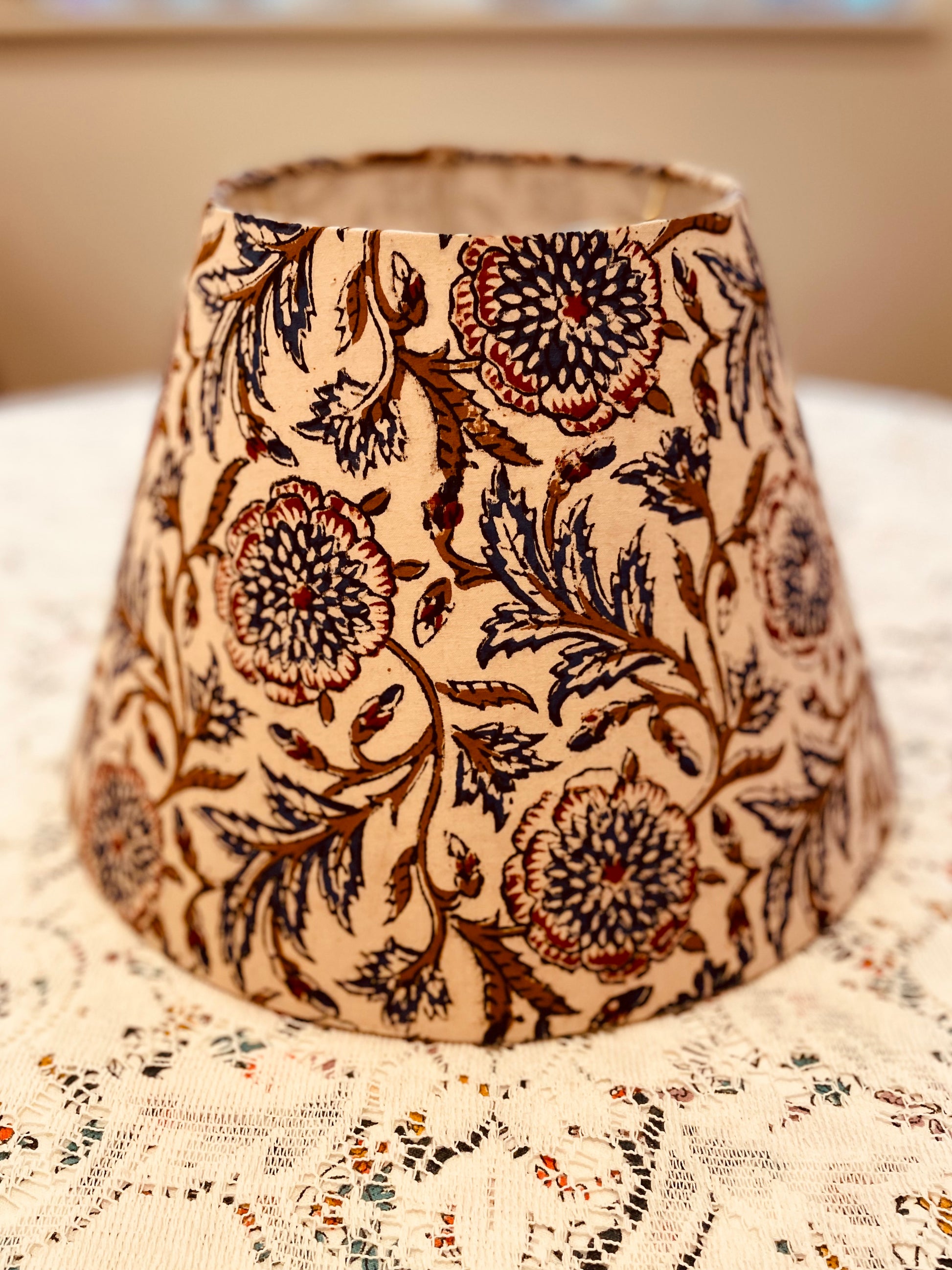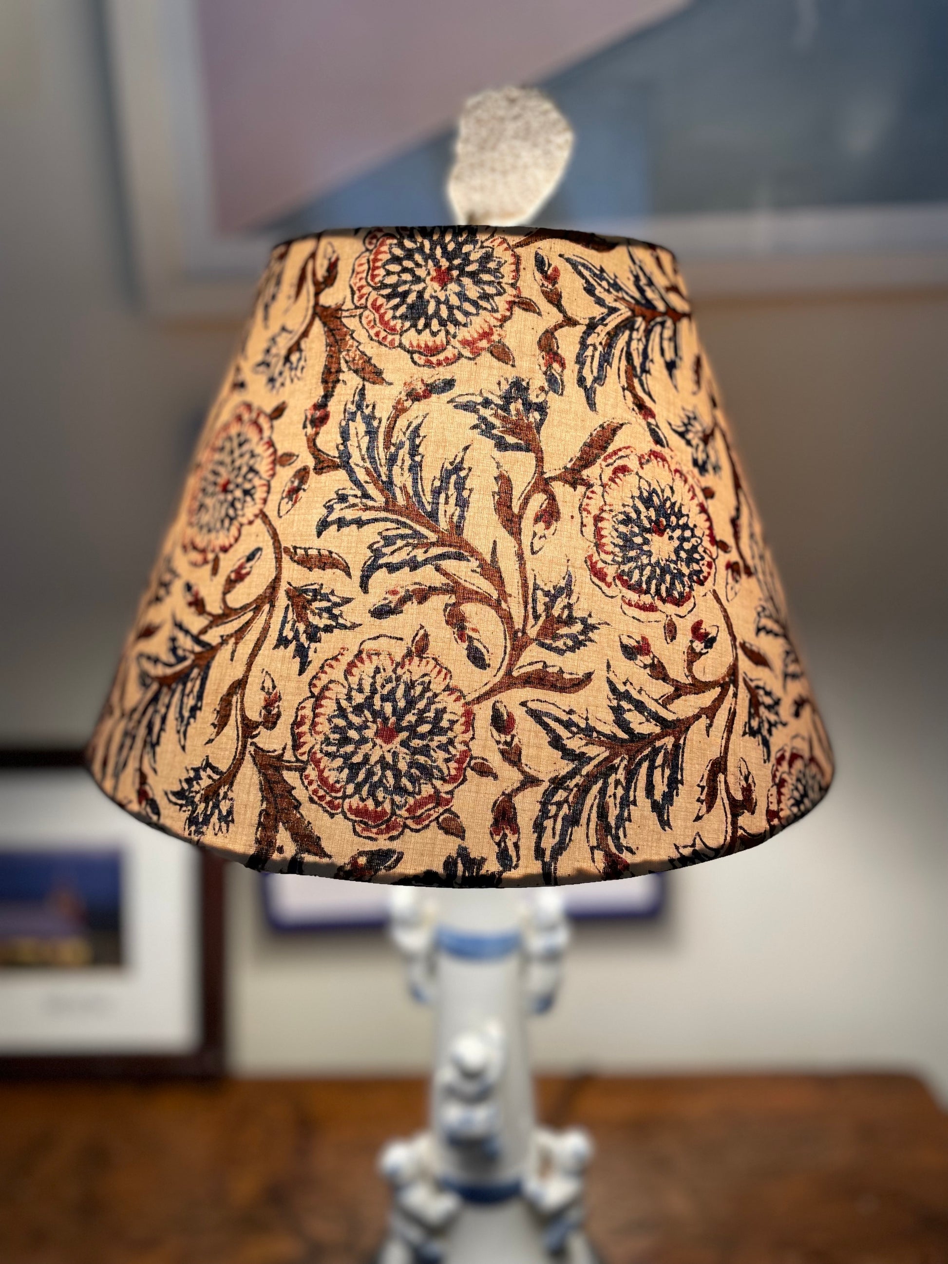 Small Conical Lampshade. Kalamkari Hand Block Print. Navy, Chestnut, and Parchment.