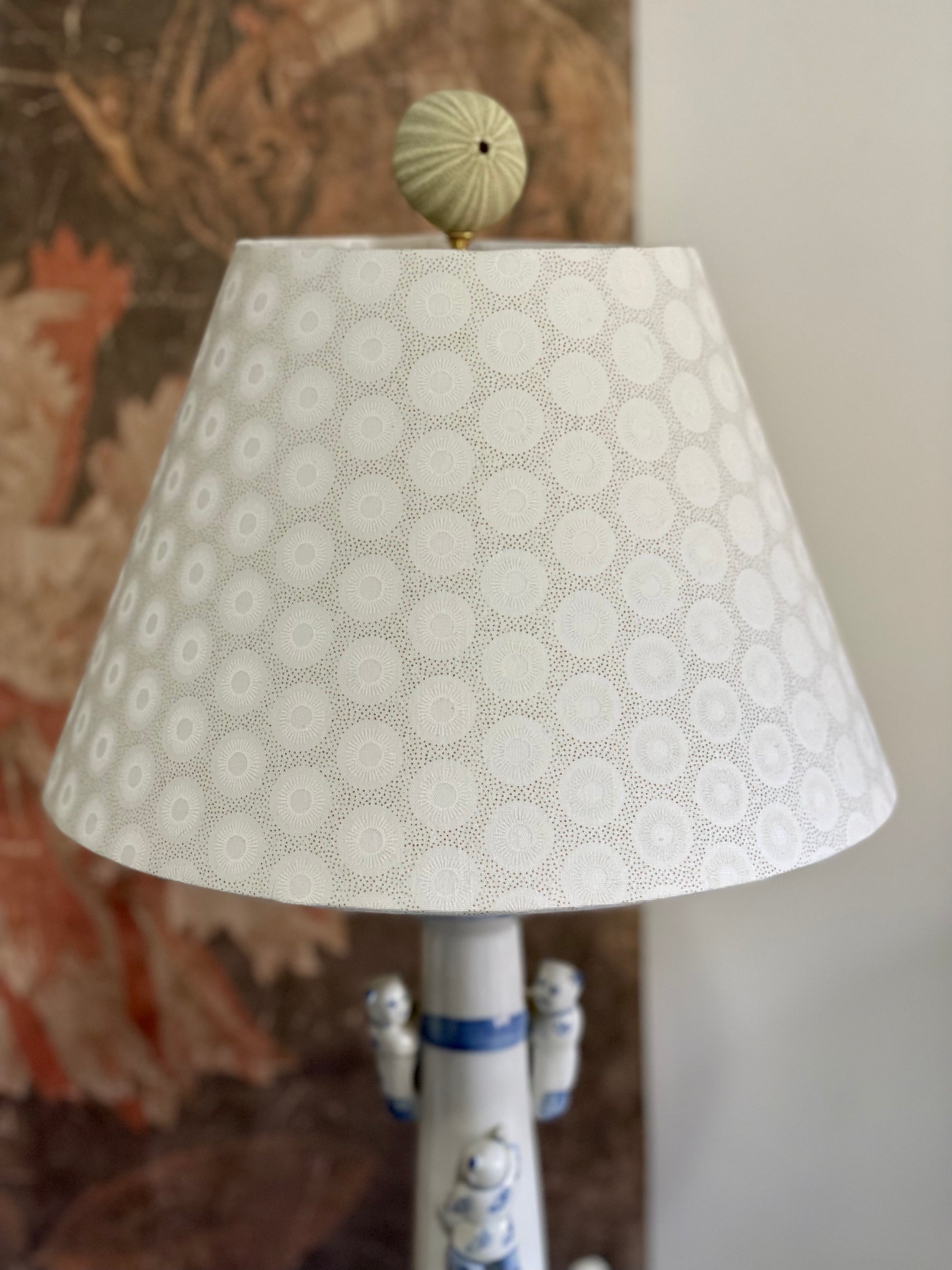 This lampshade is handmade, with vintage, hand printed, hand woven, and/or hand dyed fabric. There will be slight differences, and tiny flaws that would not appear on a mass produced item. I make the shades as carefully as possible, so if there’s ever a problem, please contact me. I’m always happy to work out an exchange or return if you are unsatisfied.