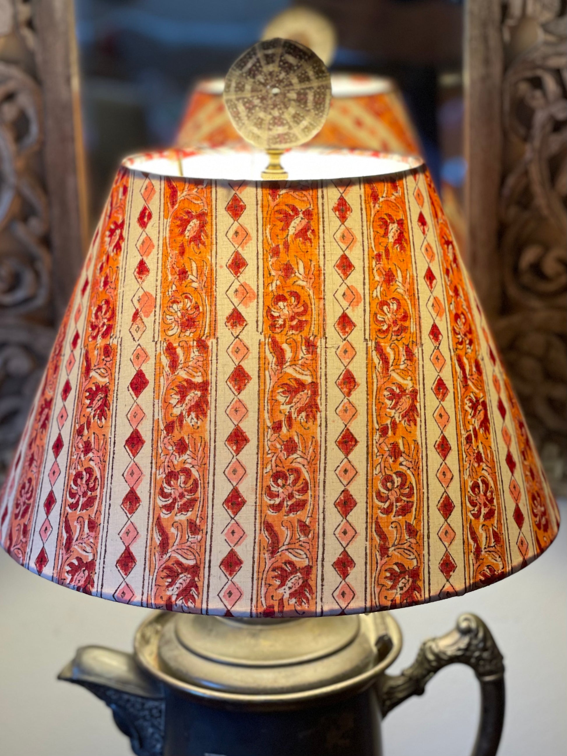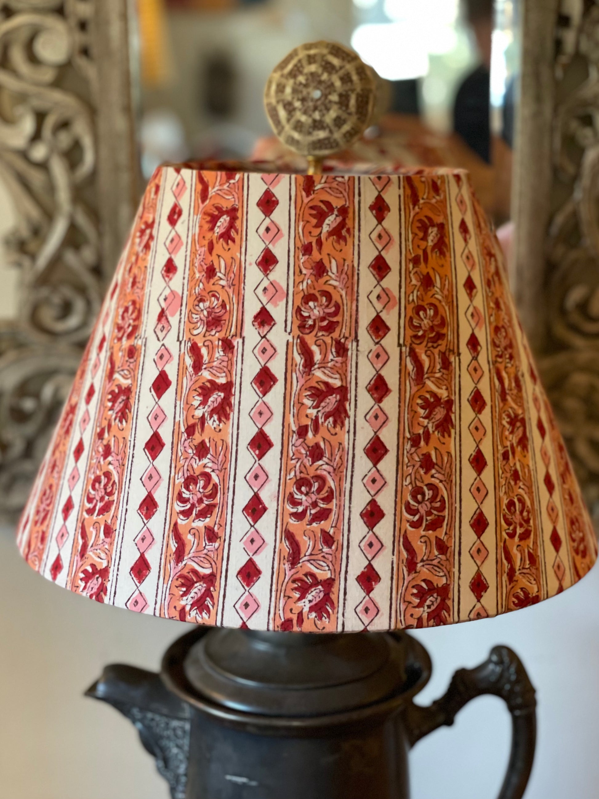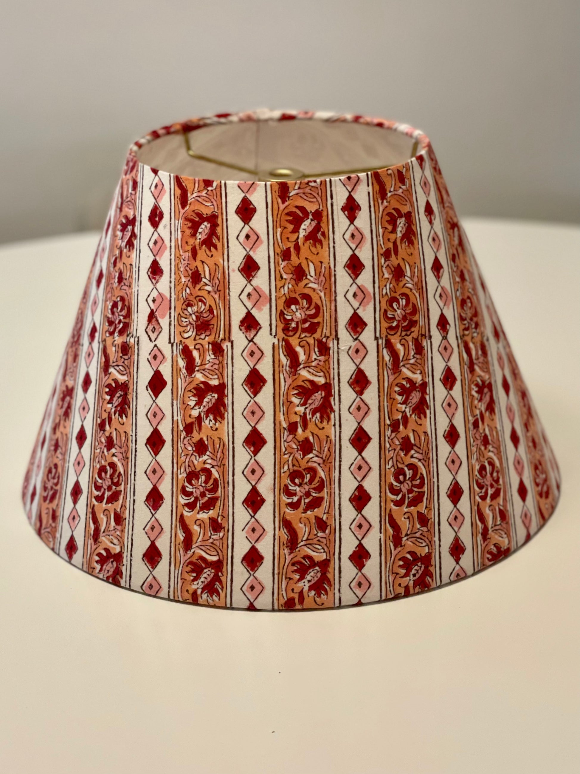 Small Conical Lampshade. Sanganeri Block Print from India. Shades of Rose and Warm Pink Stripes.